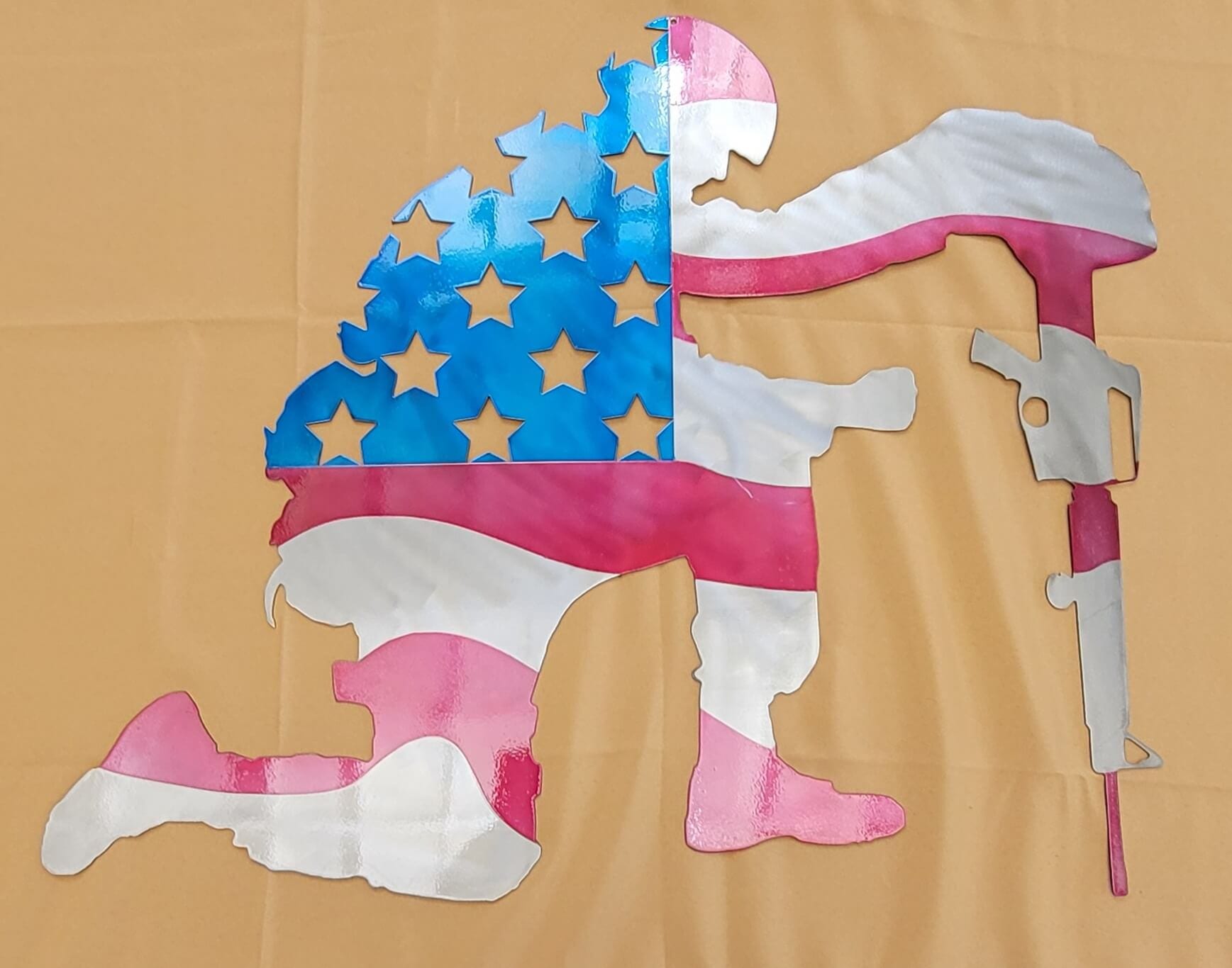 This flag is cut from 16 GA cold rolled steel. Powder Coated using transparent red and blue then covered with clear coat to provide a stunning finish.